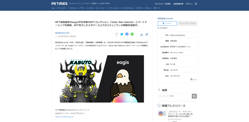 1件は株式会社woorthによる、「NFT真贋鑑定のeagisとのパートナーシップ」である。