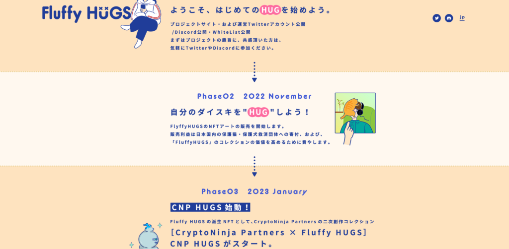 ※CNPの派生コレクションにはNinjaDAOが正式にバックアップしてリリースされるいわば「正式コラボコレクション」と、NinjaDAOに許可を得て独自にコレクションを展開するいわば「派生コレクション」が存在する。正式コラボコレクションの代表的なものはCNP Jobs等であり、今回のCNP HUGSは後者の「派生コレクション」にあたる。