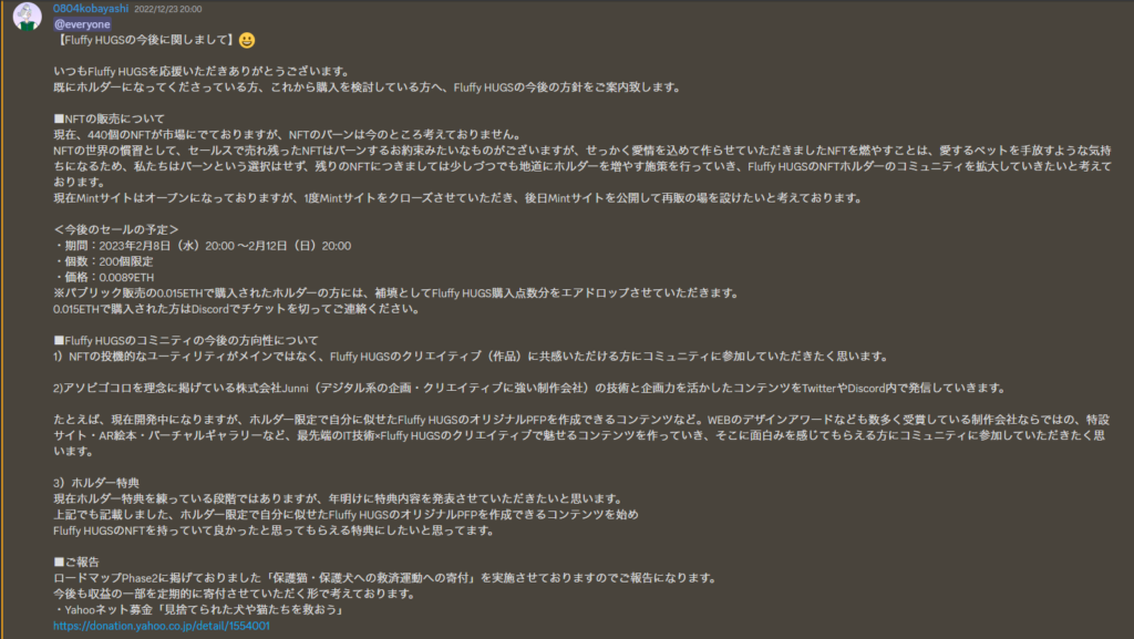 寄付に関してプロジェクト側からリリースがあったのは12月23日のディスコードにおける「お知らせアナウンスメント」においてである。