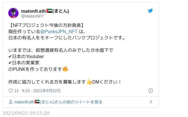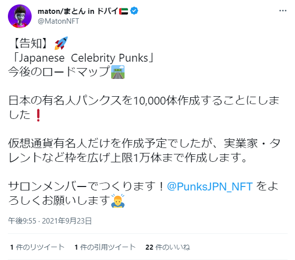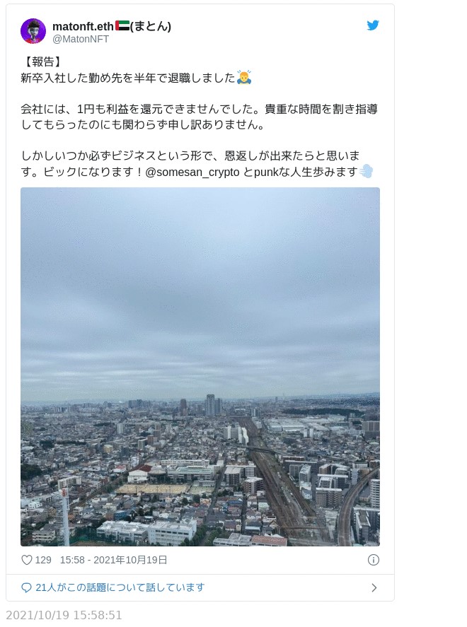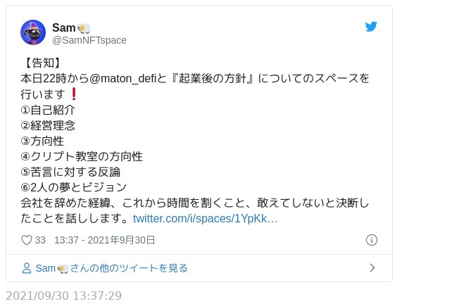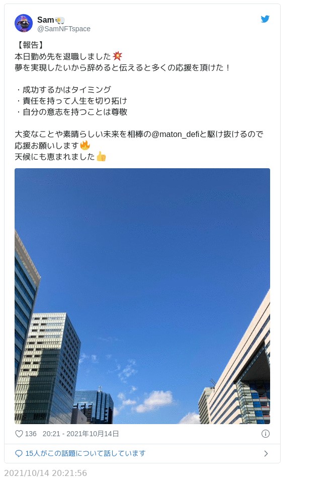 その後、10月14日にSam氏が、10月19日はMaton氏がそれぞれ勤務していた会社を退職し、NFTで起業することをツイッターで発表。