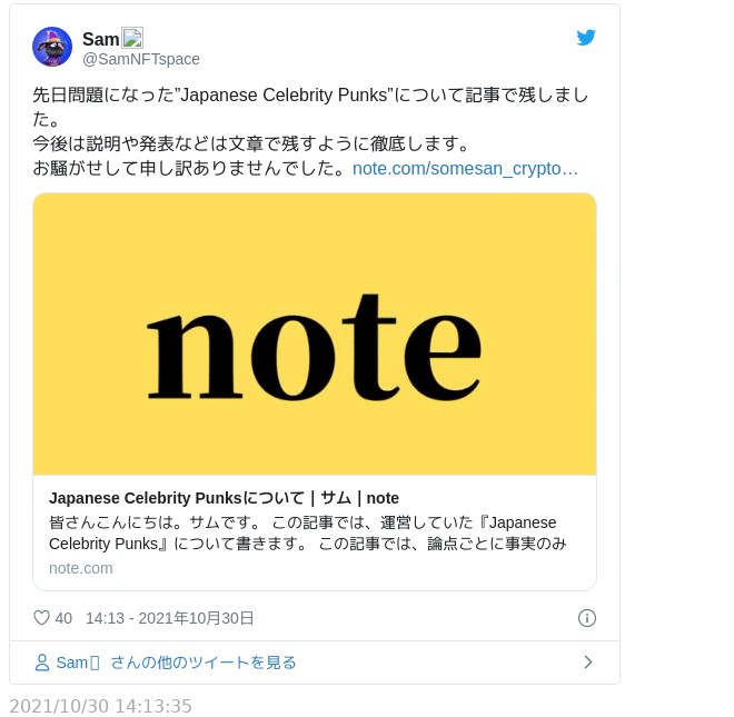 その後、10月30日にSam氏がJapanese Celebrity Punks撤退の経緯をnoteにて公表。