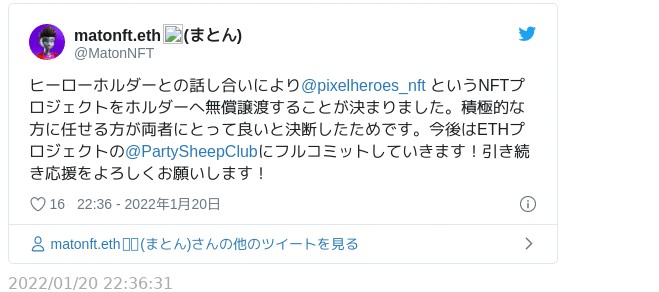 PSC発売開始の翌日20日、ホルダーとの話し合いに基づき、PixelHeroes事業を彼らからホルダー(ホルダーにより結成されたDAO)に無償譲渡されることが発表される。