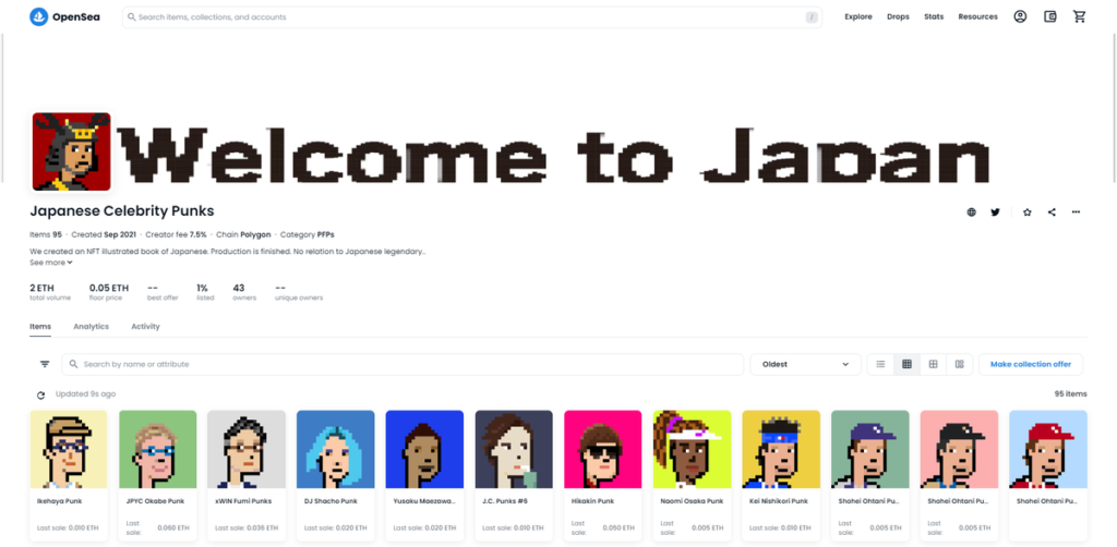 Japanese Celebrity PunksはCryptoPunksをベースに日本の著名人をドット絵で表現している。(明らかに実在の人物をベースにしている作品も存在するが、モデルとなった人物への肖像権についての許諾は確認できていない)