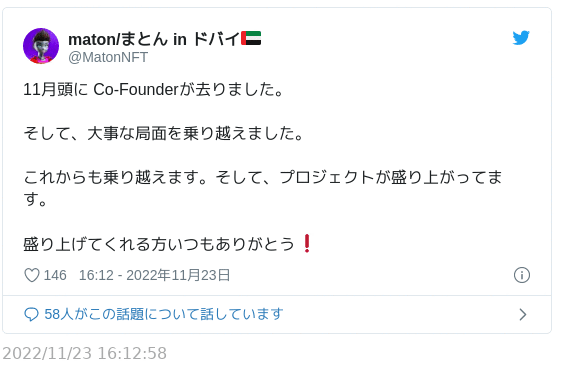 そして11月23日、Maton氏がCo-Founderが去った旨をツイートする。