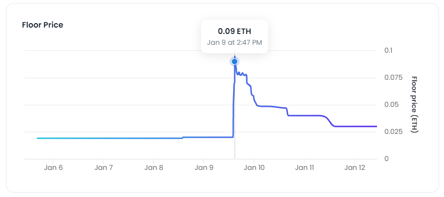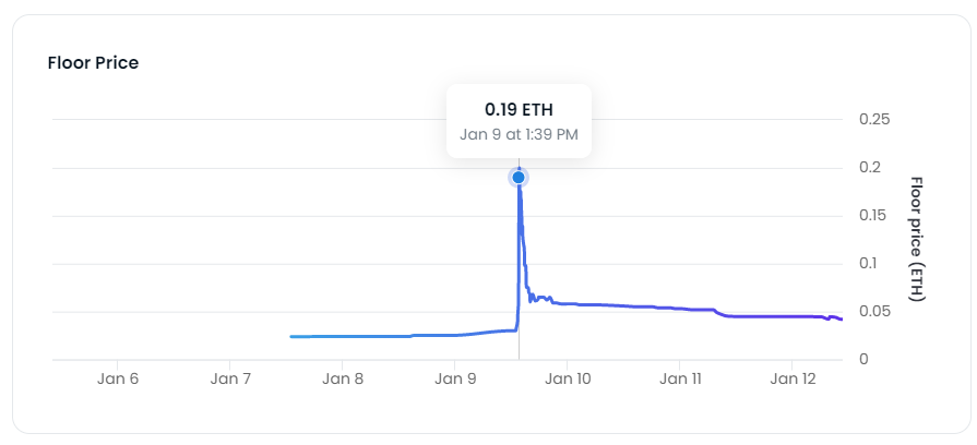 次にPSCLのフロアプライスの推移がこちらの画像である。こちらは1月9日午後に0.03から0.19まで一気に急騰しその後すぐに0.068まで下落。12日時点では0.04ETHに下落している。(PSCLのパブリックセールミント価格は0.04)