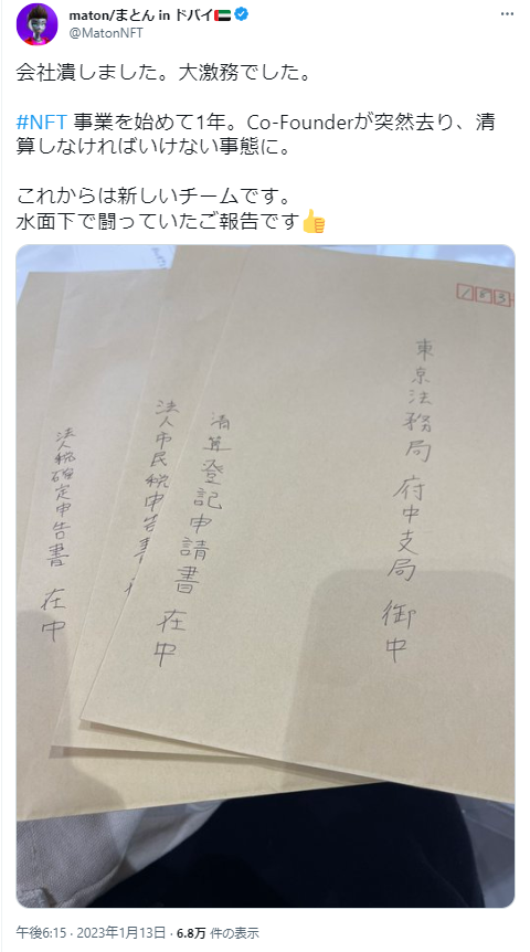 そして1月13日、Maton氏が会社を精算したことをツイート。