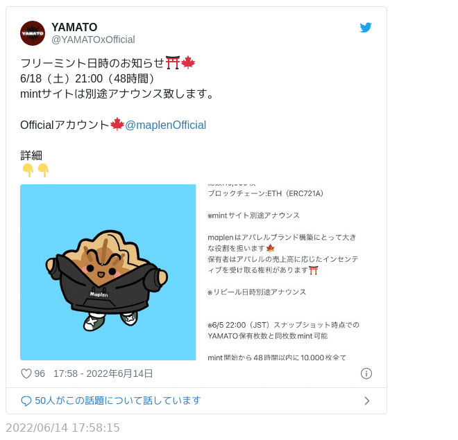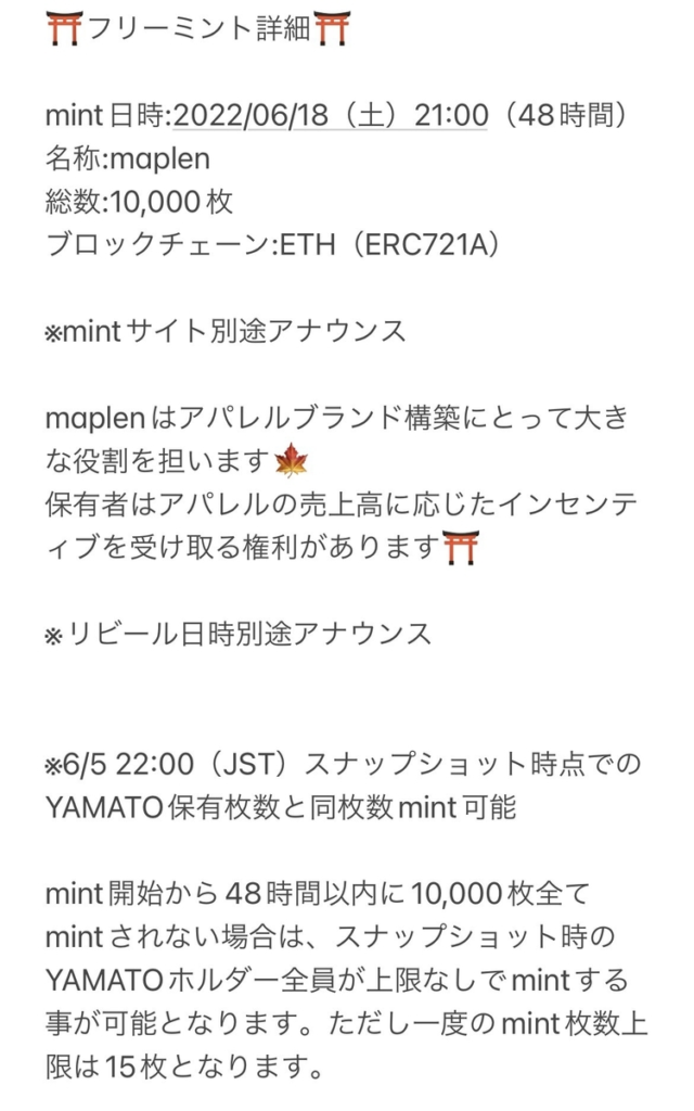 それとほぼ時を同じくしてYAMATONFTホルダー向けへの「Maplen」という名称のNFTがフリーミントで提供されることがツイートされた。