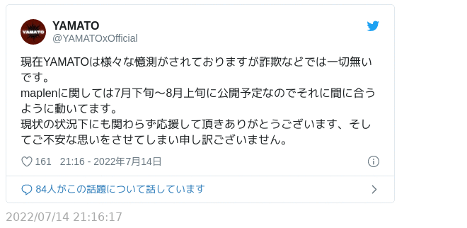 公式ツイートが激減したことからYAMATOの運営についての疑問が発生する。セカンドコレクションのMaplenはまだ全ミント完了していない7月14日に、1週間ぶりに公式がツイートする。これは詐欺などの憶測を否定する内容であった。