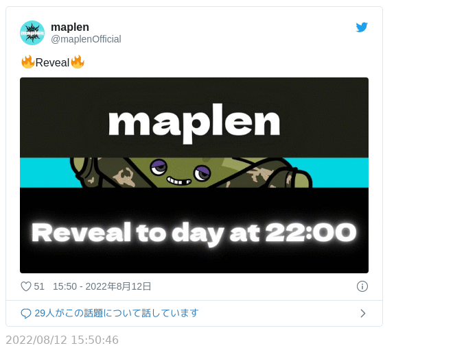このツイートから約1ヶ月後の8月12 日、Maplenがリビールされる。ミント開始から55日後、完売から23日後のことである。