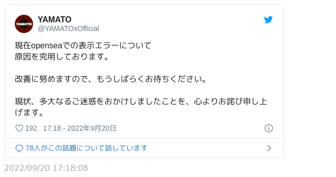 次のツイートのきっかけは9月20日、YAMATONFTがOpenseaから消えた(いわゆるDelist)ことである。