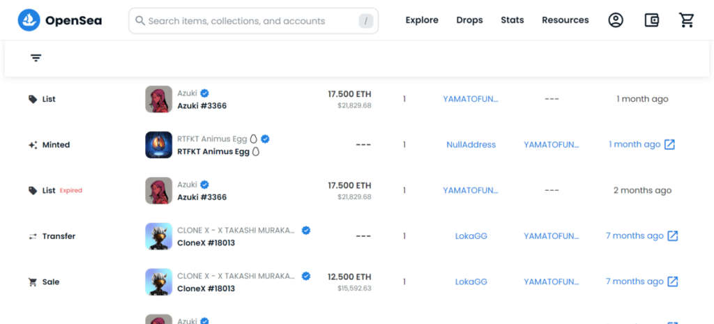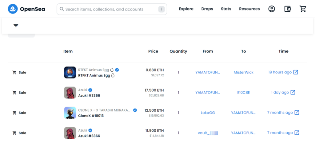 動きがあったのは、2023年1月5日である。リストしたAZUKIが売れたのである。更に同日、YAMATOはRTFKT Animus Eggもリストする。こちらはフロアプライスよりも低価であったことからすぐに約定する。