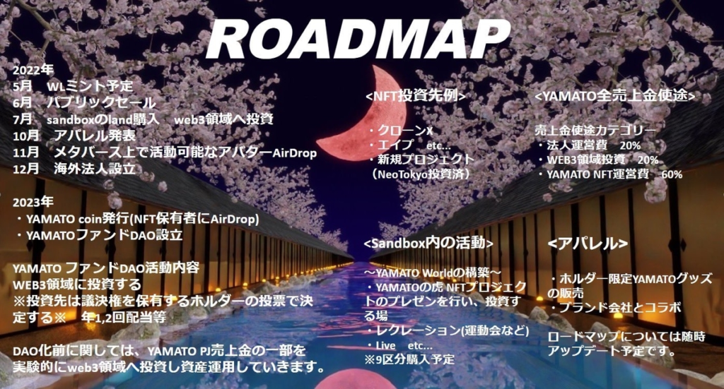 ・ロードマップはアパレルの開発、メタバース上のアバター、コインの発行、そして投資に関するDAO(ファンドDAOと称されている)の設立