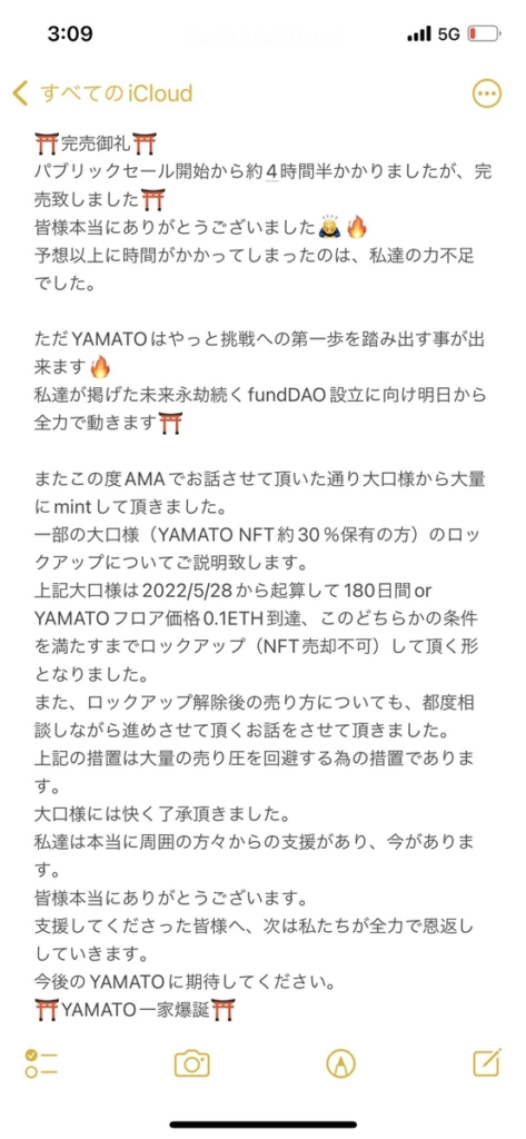 昨日までOpenseaで表示されていたYAMATONFTがいきなり見えなくなったために、ホルダーなどの間で「YAMATOが自らNFTを消して逃げたのか?」という、いわゆるラグプルの可能性がささやかれる。これについて釈明するためのツイートが公式アカウントからなされる。